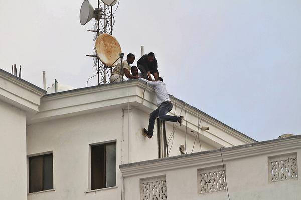 La foto in alto si riferisce all’attentato subito dall’hotel Maka al Mukarama nel novembre 2013. Più in basso gli ospiti dell’albergo tentano di rifugirsi sul tetto. Infine l’ambasciatore Yusuf Beri Beri