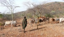 A group of Eritreans lines up outside a small, green army tent surrounded by yellow scrubland at the top...
