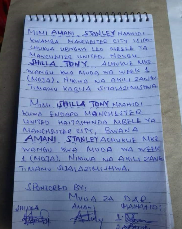 Il fatto più bizzarro e sconcertante – almeno tra quelli rilevati più recentemente – sembra però quello avvenuto in Tanzania a seguito di una singolare scommessa tra due fratelli; Amani Stanley e Shilla Tony, rispettivamente tifosi del Manchester City e del Manchester United. I due, non disponendo di denaro contante, decidevano di offrire come posta per la scommessa le rispettive mogli, da cedere al vincitore per un’intera settimana di libero “utilizzo”. L’accordo veniva anche messo per iscritto alla presenza di due testimoni che lo confermavano sottoscrivendolo a loro volta. La partita tra le due squadre, tenutasi sabato scorso, si è conclusa con la vittoria della squadra ospite, il Manchester United. In ossequio all’accordo concluso, Amani Stanley, sarà ora tenuto a cedere la propria moglie al fratello. Il sito Nairobinews, che ha diffuso l’incredibile notizia, afferma di non averla potuta verificare, ma è stato in grado di pubblicare l’accordo autografo sottoscritto dalle parti. Accordo che anche noi riportiamo in questa pagina.