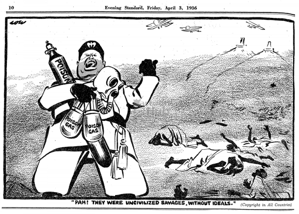 Le critiche rivolte all’Italia per l’impiego delle armi chimiche in Etiopia, sia dai suoi censori interni, sia da quelli esterni (Gran Bretagna e Francia in testa) trovano una certa legittimazione nel fatto che solo nel 1996, sotto il governo di Lamberto Dini, l’Italia ammise, tardivamente, di aver fatto uso di gas nella campagna coloniale d’Abissina, cosa che fino a quel momento non aveva voluto ammettere. Che però sia stata la Gran Bretagna a salire per prima sul podio degli accusatori, è quantomeno ipocrita, visto che proprio l’esercito di Sua Maestà, fece uso dei gas nel 1931 e nel 1935 a Sulainam in Iraq e in Afghanistan contro la tribù ribelle dei Pathane.