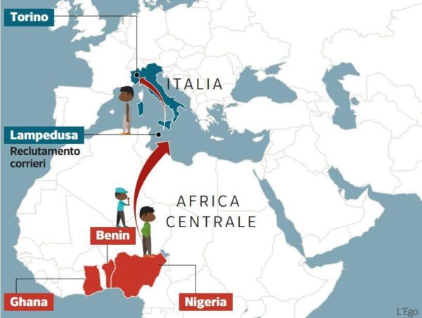 In Europa, il triste primato del consumo di droga va alla Gran Bretagna che, da sola, conta il 20 per cento di eroinomani e il 30 per cento di cocainomani dell’intero continente europeo. Forse, come sostengono alcuni osservatori, sarebbe più utile combattere il consumo piuttosto che dedicarsi al vano tentativo di contrastare il traffico. Per introdurre la droga in Italia, i nigeriani, utilizzano corrieri che ricevono circa tremila euro per ogni trasporto andato a buon fine. Si tratta soprattutto di donne, provviste di regolari permessi di soggiorno, che vengono utilizzate non più di due/tre volte per evitare che la ripetizione dei visti insospettisca la polizia di frontiera. Ad alcune di queste donne sarà poi conferito il titolo di “maman” per avviarle alla gestione delle prostitute (vere e proprie schiave sessuali) di prevalente origine nigeriana.