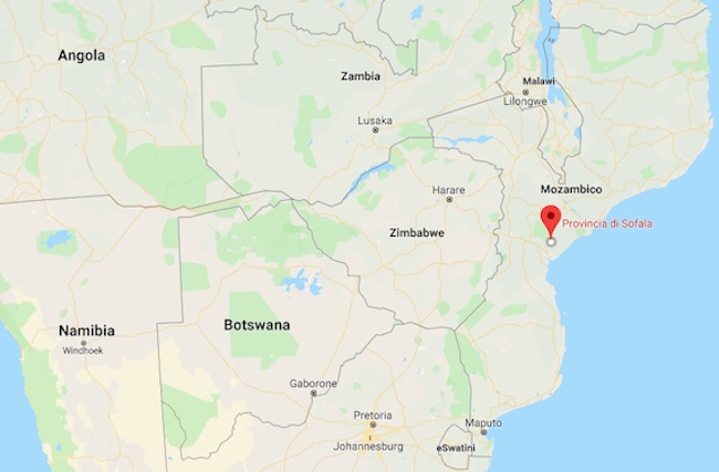 Mappa dell’Africa Australe con il Mozambico e la provincia di Sofala (Courtesy Google Maps)