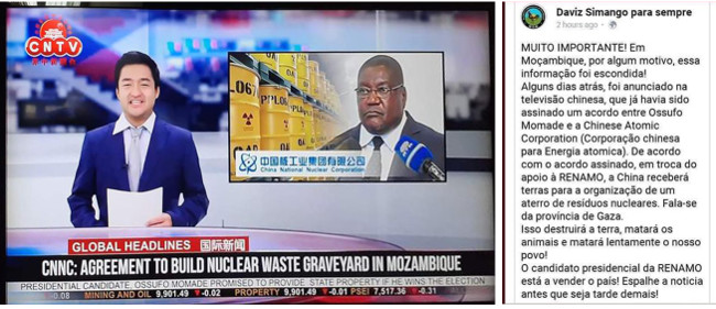 Nei giorni scorsi è circolata anche una fake news per screditare il candidato RENAMO alla presidenza, Ossufo Momade. Appare l’immagine una schermata con il tg dell’emittente cinese CNTV e nel titolo si annuncia che Momade ha firmato un accordo con la China National Nuclear Corporation. È allegato a un post ma non si capisce di quale social.