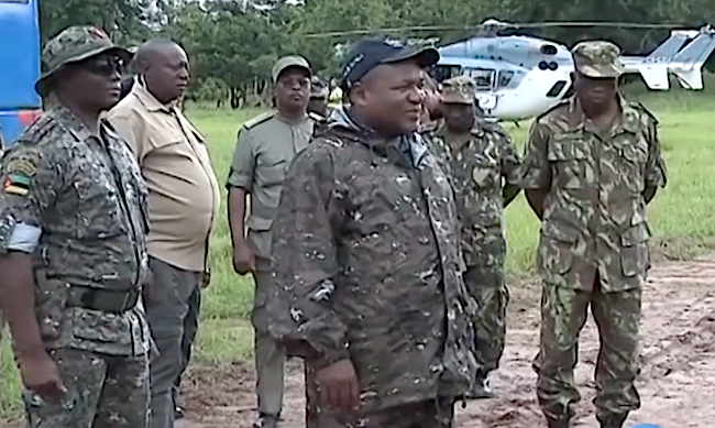 Il presidente Filipe Nyusi con i militari a Cabo Delgado