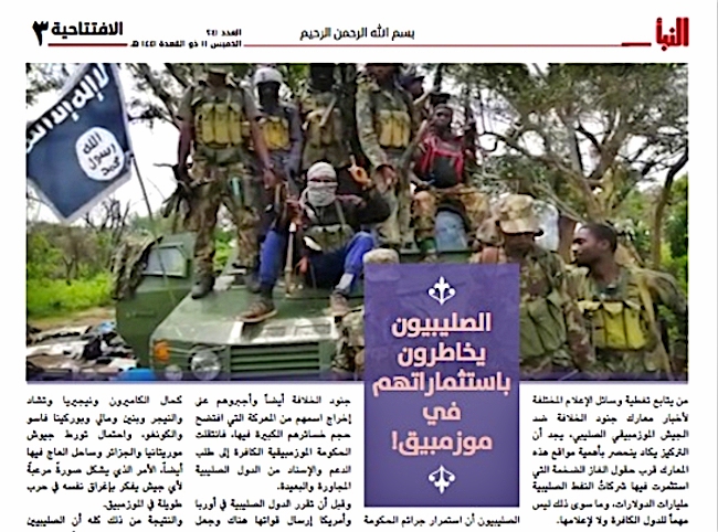 “Se i crociati ritengono che il loro sostegno al governo miscredente in Mozambico proteggerà i loro investimenti si sbagliano. Saranno degli illusi e i soldati del Califfato li spingeranno fuori dai giacimenti di gas”. Sono pesanti le parole di un proclama scritto su al-Naba, voce dell’ISIS, tradotto in inglese in un editoriale di Aymenn Jawad Al-Tamini sul suo blog. Parte del testo viene ripreso nella newsletter Mozambique News Reports & Clippings, da Joseph Hanlon esperto di Africa Australe, docente alla Open University (Regno Unito). Ed è stato fatto circolare in Mozambico e in occidente.