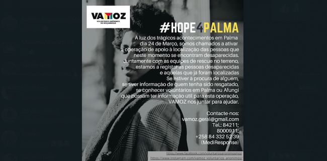 E nasce l’iniziativa #HOPE4PALMA (speranza per Palma), un’iniziativa lanciata dai Volontari anonimi del Mozambico. L’obiettivo è avere informazione delle persone di cui non si hanno notizie nella cittadina del gas.