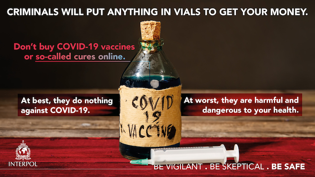 “I criminali, per accaparrarsi denaro, mettono qualsiasi cosa nelle fiale. Non comprare online i vaccini Covid-19. Nel migliore dei casi sono inutili contro il Covid-19. Nel peggiore ti fanno male e sono pericolosi per la tua salute”. È uno dei messaggi di allarme che l’Interpol fa circolare nel web per sensibilizzare i cittadini sui falsi vaccini. L’Organizzazione internazionale della polizia criminale a marzo ha messo in allarme i 194 Paesi associati sapendo che, prima o poi, sarebbero apparsi sul mercato.