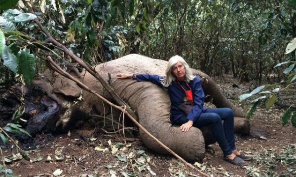 Kuki Gallman accanto al cadavere di un elefante appena abbattuto dai bracconieri