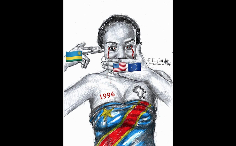 Un volantino mostra una donna che rappresenta la RDC con lacrime di sangue. Una mano USA e UE le tappa la bocca mentre un’altra mano, con bandiera del Ruanda, ha tre dita a forma di pistola sulla tempia. Un malinteso da chiarire prima possibile visto che fondi del Consiglio UE sono destinati esclusivamente al proseguimento della missione militare ruandese a Cabo Delgado.