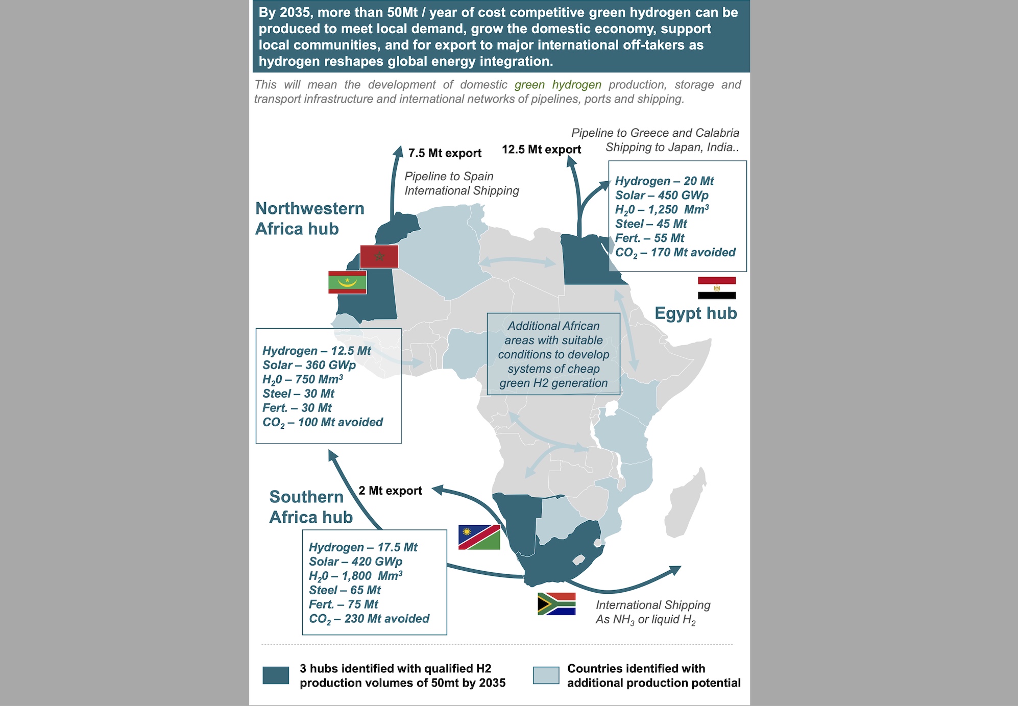 L’investimento è di mille miliardi e, secondo le previsioni, l’idrogeno verde fornirebbe in terzo del consumo dell’energia attualmente utilizzzata in Africa. Ma il rapportano si sbilancia sui tempi di realizzazione del progetto.