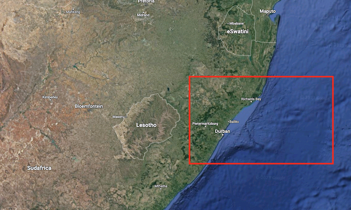 Mappa dell’area delle manovre militari di Sudafrica, Russia e Cina (Courtesy GoogleMaps)