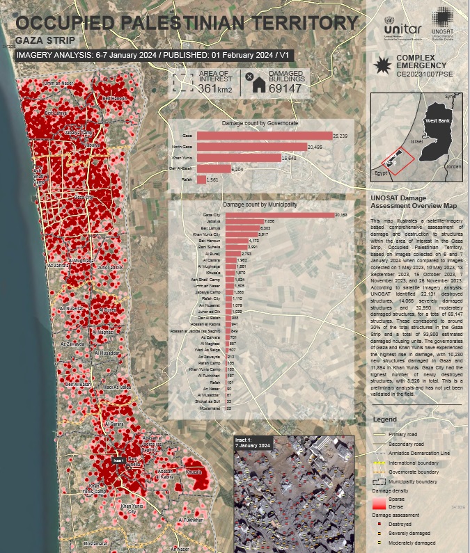 Continua per altro la distruzione di infrastrutture, abitazioni e case e interi quartieri. Tra fine gennaio e primi di febbraio sono stati tirati giù diversi edifici di Khan Younis con le ruspe e le bombe. Secondo un report di Unosat (United Nation Satellite Center) https://unosat.org/products/3793 che utilizza immagini satellitari comparando foto ricavate tra maggio/novembre 2023 con altre dei primi di gennaio 2024, a Gaza sarebbe stato distrutto il 30 per cento degli edifici, per un totale di quasi 70 mila costruzioni e almeno 93 mila abitazioni. Ma dalle immagini si vede come siano scomparsi i terreni agricoli a suon di bombe e buldozer eliminando qualsiasi vegetale commestibile.