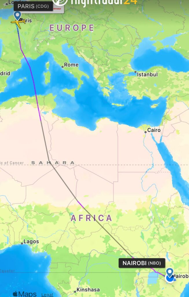 Itinerario diverso invece quello seguito con a bordo i miei figli che sono partiti da Parigi alla stessa mia ora ma hanno viaggiato con un vettore africano, la Kenya Airways.