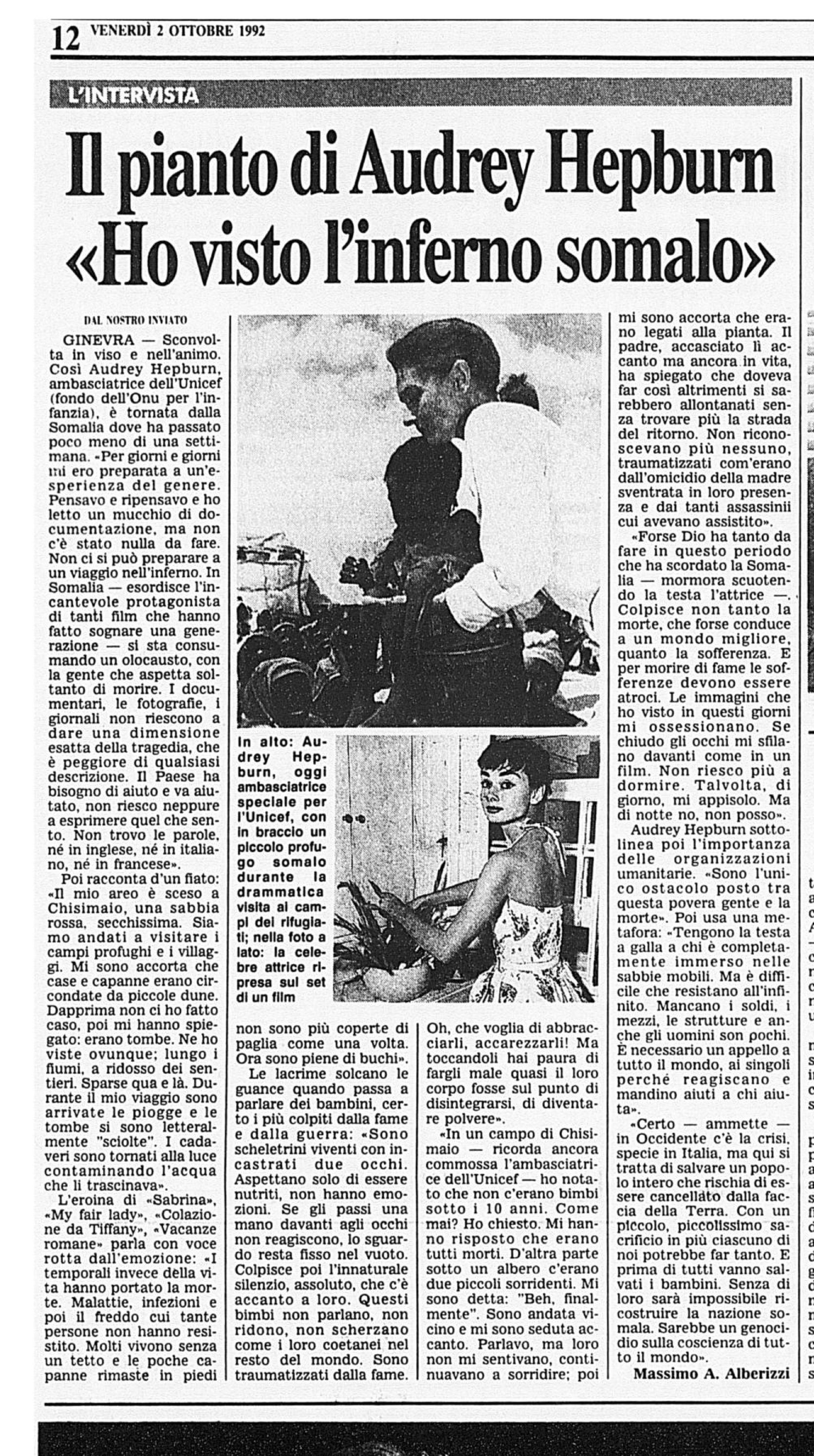 Sconvolta in viso e nell’animo. Così Audrey Hepburn, ambasciatrice dell’Unicef (fondo dell’ Onu per l’ infanzia), e’ tornata dalla Somalia dove ha passato poco meno di una settimana. “Per giorni e giorni mi ero preparata a un’esperienza del genere. Pensavo e ripensavo e ho letto un mucchio di documentazione, ma non c’ è stato nulla da fare. Non ci si può preparare a un viaggio nell’inferno. In Somalia – esordisce l’incantevole protagonista di tanti film che hanno fatto sognare una generazione – si sta consumando un olocausto, con la gente che aspetta soltanto di morire. I documentari, le fotografie, i giornali non riescono a dare una dimensione esatta della tragedia, che è peggiore di qualsiasi descrizione. Il Paese ha bisogno di aiuto e va aiutato, non riesco neppure a esprimere quel che sento. Non trovo le parole, né in inglese, né in italiano, né in francese”.