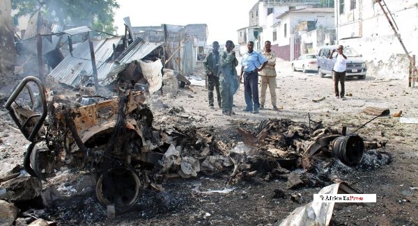 Somali soldiers look at the wreckage of the car that detonated the bomb near the entrance of Mogadishu’s court complex, Mogadishu, Somalia, Sunday, April,14, 2013. Militants launched a serious and sustained assault on Mogadishu’s main court complex Sunday, detonating at least two blasts, taking an unknown number of hostages and exchanging extended volleys of gunfire with government security forces, witnesses said.(AP Photo/Farah Abdi Warsameh)