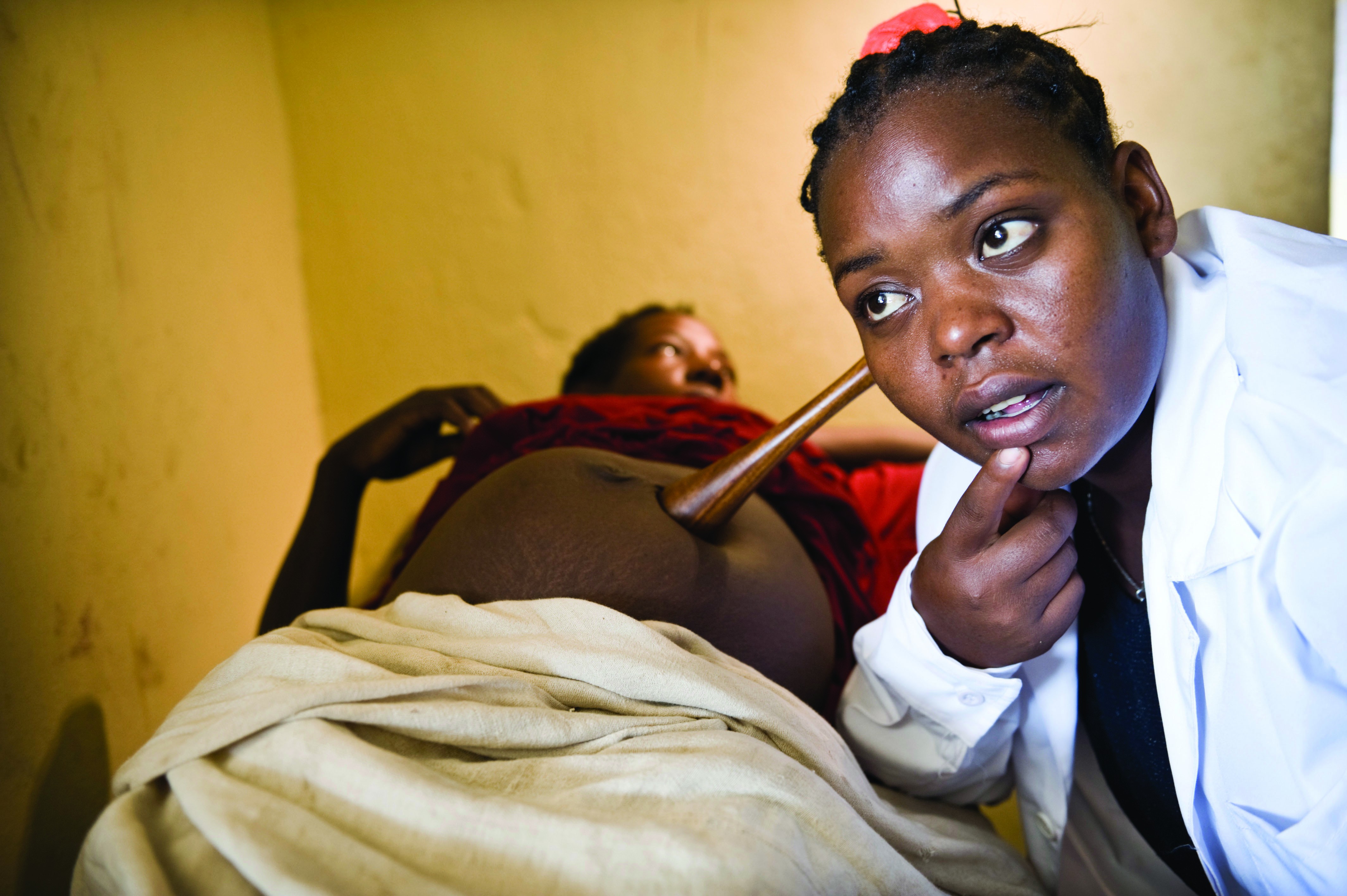 foto: Sven Torfinn. December 2009. Ethiopia, South Omo province, Male district, Kamba Umbu village. Tadelech Shibesh, Health Extension Worker, examining Zankako Zenma, pregnant woman, at health post in Kamba Umbu village.