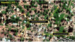 A comparison of satellite images of Bouca taken on 27 April 2012 and 2 November 2013 reveals significant fire damage in central and eastern parts of the town, affecting approximately 485 houses, leaving a large area severely damaged.