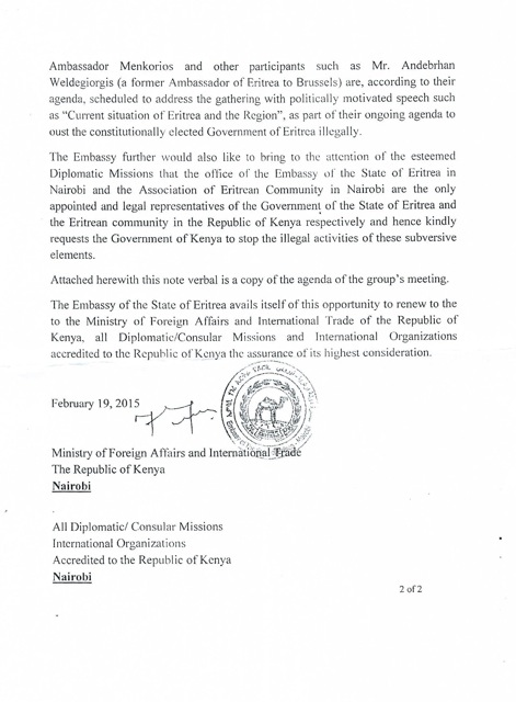 “The Embassy has learn that a group of subversive Eritreans national in Naiorbi are planning to organise an illegal political gathering or meeting under the name of “Eritrean Diaspora in East Africa” on Friday 20th February 2015 with a main aim of inciting national against the Government of the State of Eritrea”