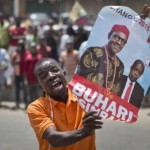 Supporters of opposition candidate Gen. Muhammadu Buhari’s All Progressives Congress (APC) party celebrate what they said was the senatorial win in Kano Central district of APC candidate Rabiu Musa Kwankwaso, in Kano, northern Nigeria Monday, March 30, 2015. Nigerians are waiting in hope and fear for results of the most tightly contested presidential election in the nation’s turbulent history. (AP Photo/Ben Curtis)