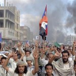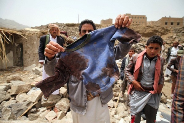 A man displays the bloodied shirt of a victim at the rubble of houses destroyed by an air strike in the Okash village near Sanaa April 4, 2015. An air strike on a village near the Yemeni capital Sanaa killed a family of nine, residents said on Saturday, in what appeared to be a hit by the Saudi-led military campaign against Houthi militia. REUTERS/Mohamed al-Sayaghi – RTR4W38K
