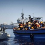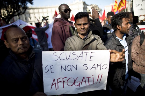 Immigrati partecipano alla manifestazione promossa dai sindacati di base (Cobas, Usb e Cub) per chiedere a gran voce la cancellazione della legge Bossi-Fini, Roma, 18 ottobre 2013 a Roma. Sul cartello la scritta: ‘Scusate se non siamo affogati’.