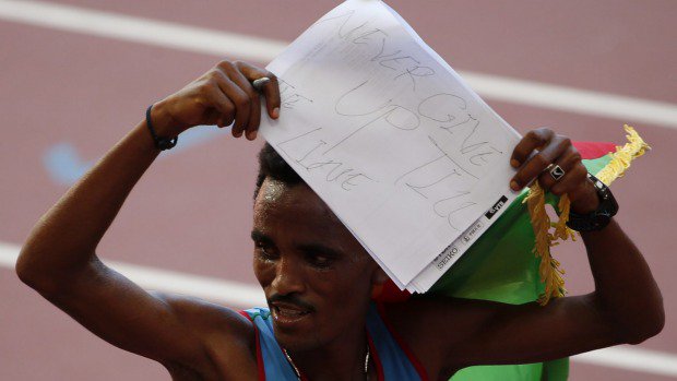 L’immagine che resterà nella storia di questi XV campionati del mondo di atletica leggera (22-30 agosto) e , sicuramente, in quella dell’Eritrea, paese piccolo e povero, ricco solo di disperati che fuggono (circa 5 mila persone al mese) da un regime durissimo e dalla miseria, è quella di questo maratoneta minuto dalle orecchie a sventola e baffi accennati, che solitario entra nel Nido (lo stadio di Pechino), afferra la bandiera verderossoazzurra, e dopo il traguardo imbarazzato non sa dove andare a causa di un’organizzazione deficitaria. E poi innalza sulla testa un foglio bianco su cui si legge questa scritta sbilenca: mai arrendersi finchè vivo (never give up till I live).