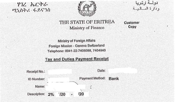 La ricevuta del pagamento del 2 per cento viene rilasciata dal Consolato di Ginevra, che da qualche tempo, per paura dei controlli delle autorità elvetiche, lo fa pervenire direttamente ai parenti dell’interessato in Eritrea. Tale ricevuta deve essere esibita ogni qualvolta le autorità eritree la richiedono. Se i familiari non ne sono in possesso, possono perdere il posto di lavoro, essere ridotti alla fame con il ritiro della tessera alimentare e altro. Ammesso e non concesso che il pagamento del 2 per cento sia un reato, l’espiazione della pena viene assegnata ai parenti.