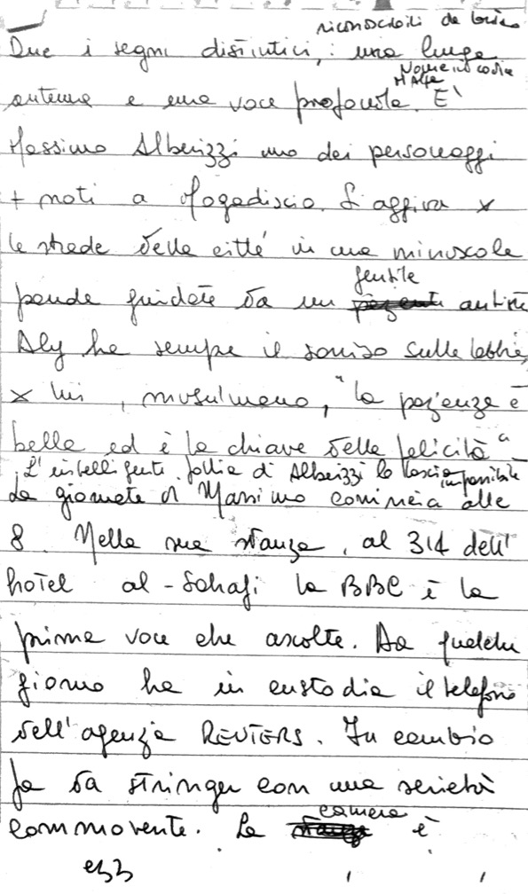 Un giorno al cancello ha bussato un collega italiano di un grande quotidiano. Pantaloni ben stirati (la riga era perfetta), valigia Samsonite con rotelle, scarpe di camoscio, camicia candida. Gli mancava solo la cravatta. Arrivava dall’aeroporto e l’unico passaggio che aveva trovato portava al Sahafi. Dopo aver visto la situazione ha chiesto con ingenuità: “Vorrei andare all’hotel degli italiani, mi chiama un taxi?”. Forse credeva di essere a Parigi e non si è reso conto che se fosse uscito dal cancello così con la sua Samsonite lo avrebbero lasciato in mutande in un baleno. Al Sahafi questa storia ha fatto il giro degli impiegati che ne ridono ancora oggi.