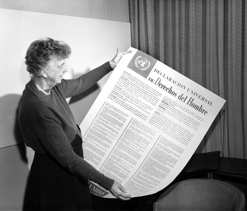 Mrs. Eleanor Roosevelt of the United States holding a Declaration of Human Rights poster in Spanish. November 1949.