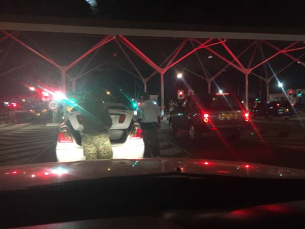 Prima di entrare nello spazio dell’aeroporto, più o meno a un chilometro di distanza, è stato allestito un piazzare dove i veicoli vengono passati al setaccio