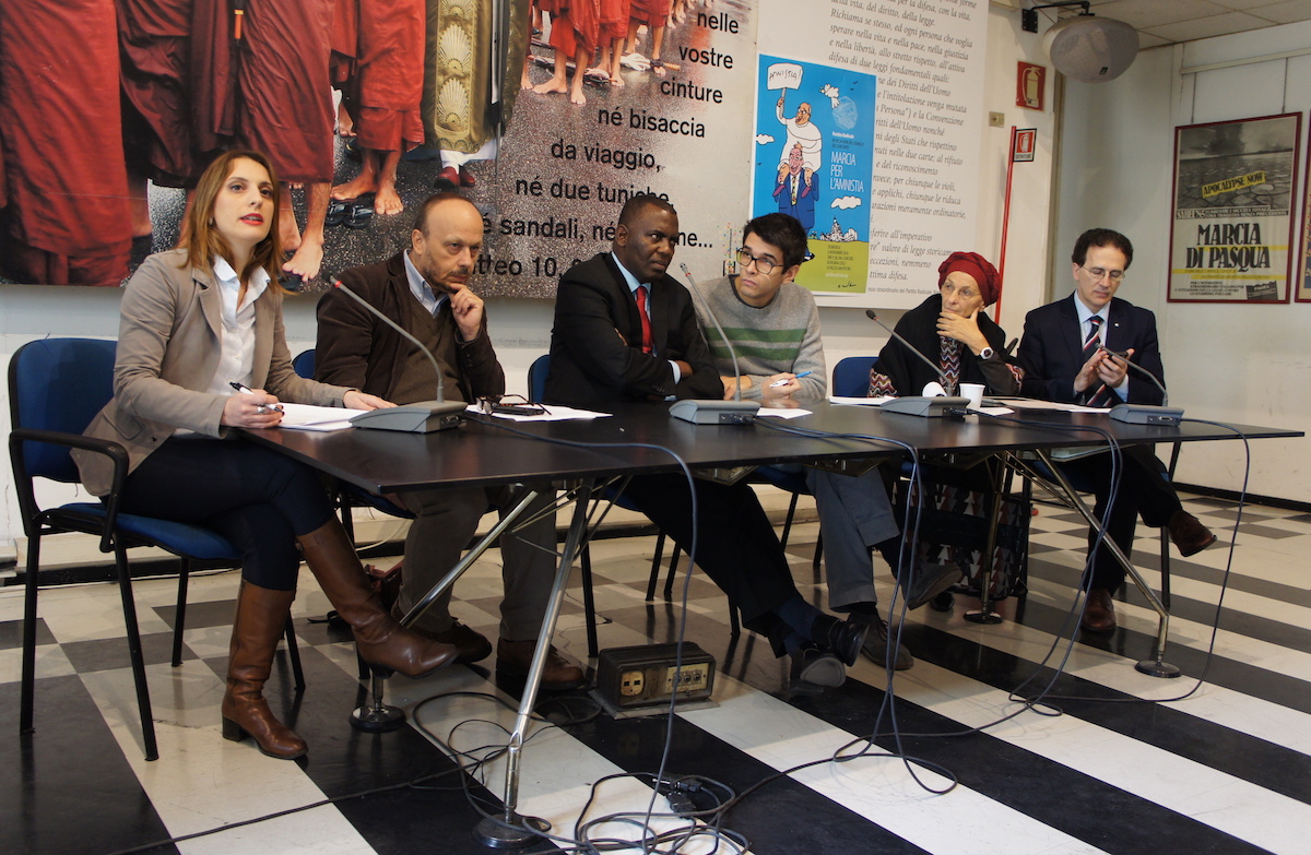 Il tavolo dei relatori dell’incontro “Schiave”, sulla schiavitù in Mauritania. Da sinistra: Antonella Soldo, Radicali Italiani, Antonio Marchesi, Amnesty International, Biram Dah Abeid, IRA Mauritaine, Emma Bonino, Antonio Strango, LIDU. Roma, 26 novembre 2016 [Foto – Andrea Spinelli Barrile]