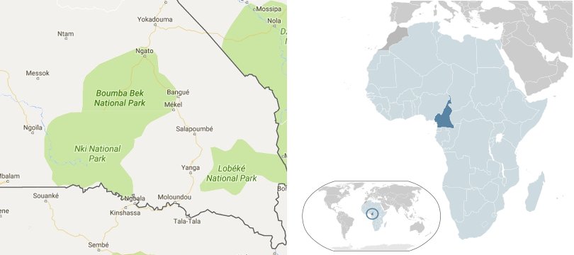 Area degli abusi contro i pigmei Baka e mappa dell’Africa con il Camerun