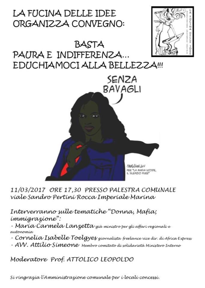 Sabato prossimo, 11 marzo, si parlerà di donne, mafia e immigrazione a Rocca Imperiale, durante un convegno organizzato dall’Associazione “La fucina delle idee”.