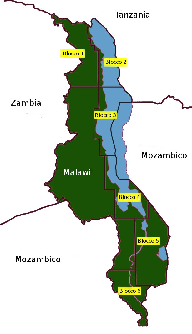 Le sei aree di indagine per la ricerca di idrocarburi del territorio del Malawi e del lago Nyassa