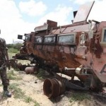 A Somali soldier looks at a burnt vehicle belonging to the AMISOM, as he patrols Dayniile district