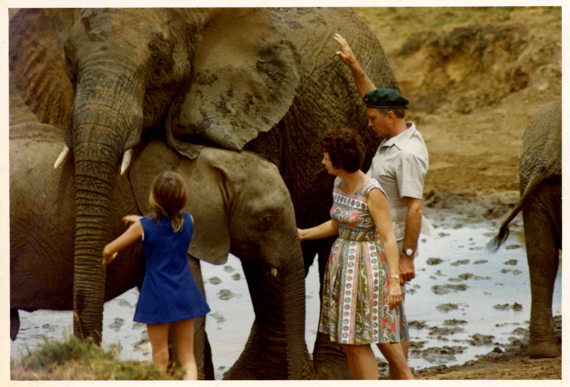 David Sheldrick, Daphne Sheldrick and Angela Sheldrick with the orphans 1973. Dr Dame Daphne Sheldrick DBE. Copyright The David Sheldrick Wildlife Trust