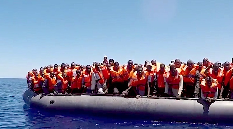Migranti su un gommone in attesa di essere salvati (Courtesy SOS Mediterranee)