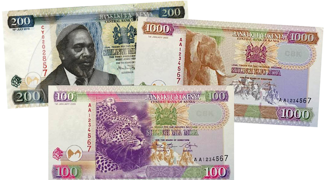 La banconota del 2010 con il primo presidente del Kenya, Jomo Kenyatta, e le nuove banconote emesse dalla Central Bank of Kenya