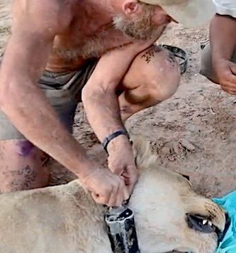 Philip Stander mentre applica un radio -collare a uno dei leoni del deserto (Courtesy Desert Lion Conservation)