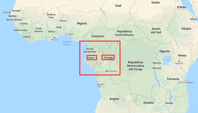 Mappa dell’Africa centrale. In evidenza Gabon e Congo (Courtesy Google Maps)