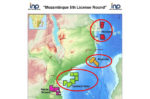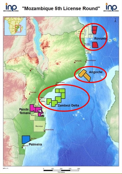 Mappa del Mozambico con le aree LNG. Nei cerchi rossi sono comprese le zone operative ENI (Courtesy INP)