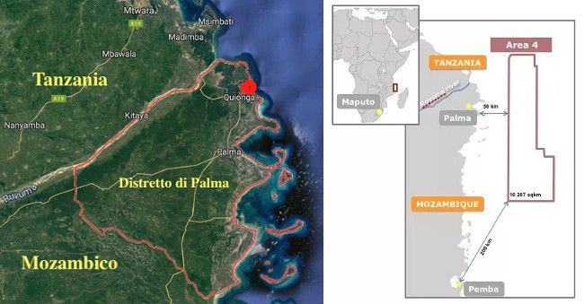 Mozambico, Distretto di Palma nella provincia di Cabo Delgado (Courtesy GoogleMaps) e l’Area 4, dove opera ENI (Courtesy ENI)