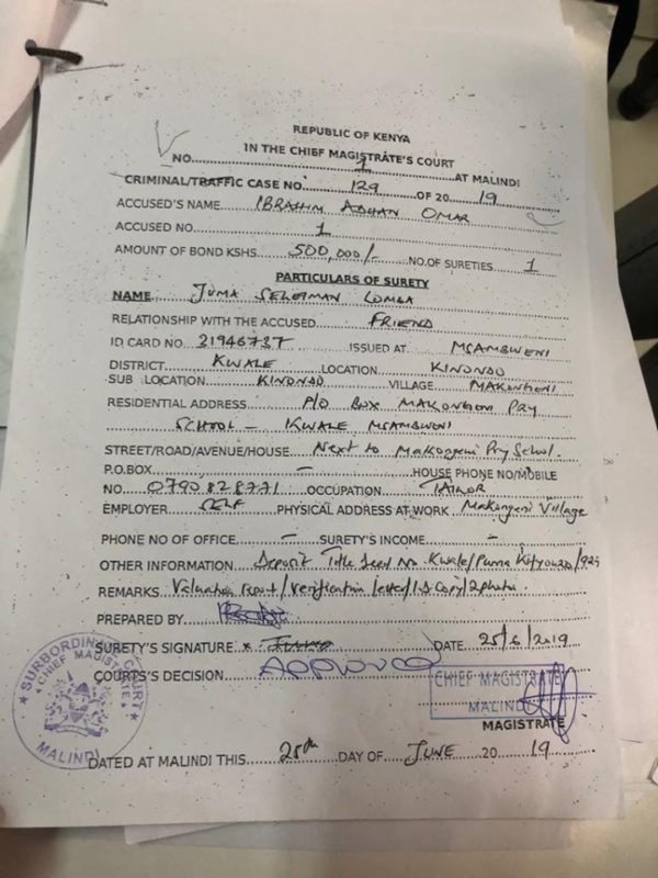 Oggi al tribunale di Malindi, il magistrato, signora Julie Oseko, ha ottenuto l’unificazione dei due processi, il primo che vede alla sbarra Ibrahim Adhan Omar e il secondo che vede imputati Abdulla Gababa Wario e Moses Luari Chembe.