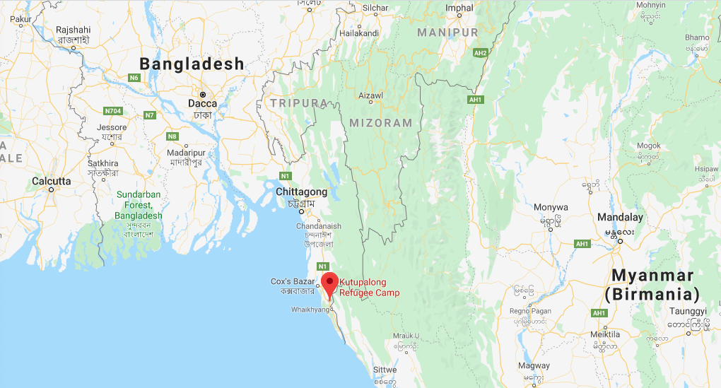 Mappa con la posizione del campo profughi rohingya di Katupalong al confine tra Myanmar e Bangladesh (Courtesy Google Maps)