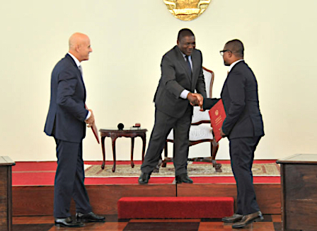 A sin Claudio De Scalzi (ENI), il presidente mozambicano Filipe Nyusi e il ministro delle Risorse minerarie Ernesto Max Tonela