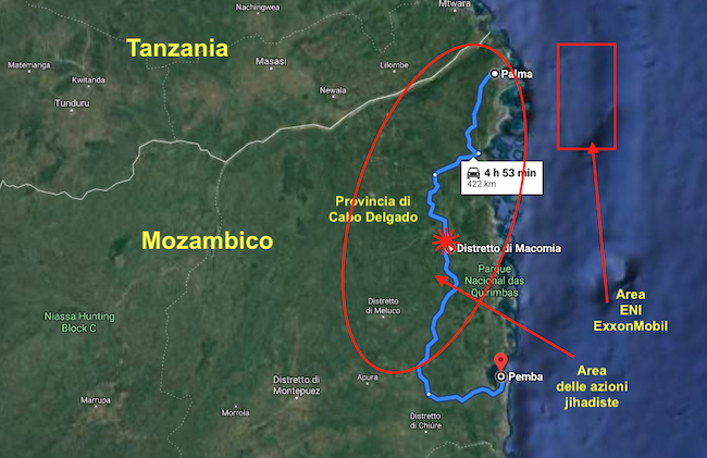 Mappa dell’agguato jihadista nel distretto di Macomia, a Cabo Delgado (Courtesy GoogleMaps)