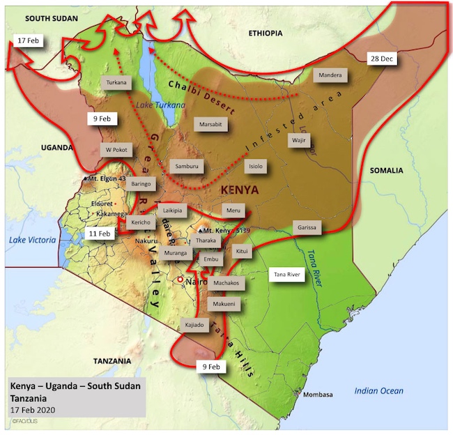 L’invasione delle cavallette in Uganda segue quella dei altri Paesi dell’Africa orientale: Kenya, Etiopia, Somalia ed Eritrea. Ma anche la Tanzania ha intercettato sciami nelle zone di confine settentrionali vicino al monte Kilimangiaro dove ha utilizzato gli insetticidi con tre aerei.