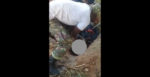 Uomo con uniforme militare sta decapitando un cadavere in una fossa comune a Cabo Delgado