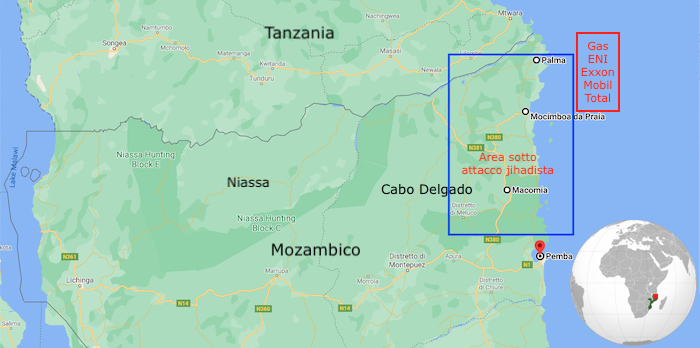 Mappa di Cabo Delgado . Evidenziate le aree di attacco jihadista e il giacimento di gas offshore (Courtesy GoogleMaps)