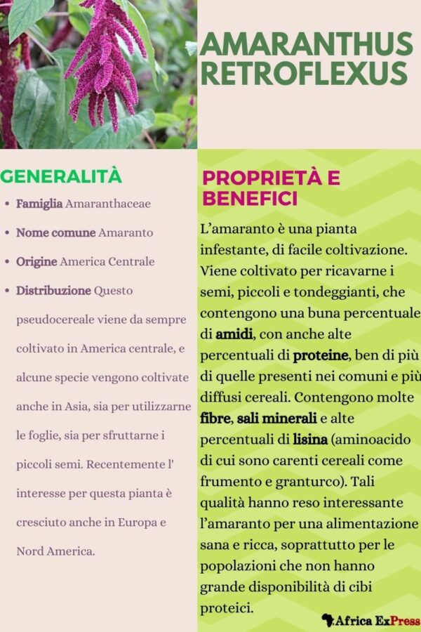 L’amaranto comune è di origine centro-americana, poi introdotta in altre parti del mondo. Pianta infestante, ha scarse esigenze idriche, con un valore nutrizionale elevato. Infatti, i suoi semi sono ricchi di proteine ad alta digeribilità. Si parla sempre più spesso di questa pianta come rimedio nelle regioni con crisi alimentari.